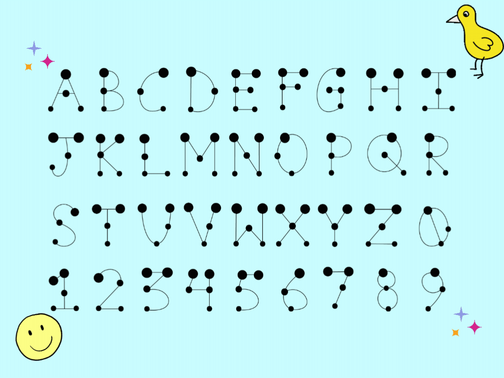This glyph set was created using one regular line and one geometric shape. This font is inspired by children's English handwriting books and incorporates a playful "connect the dot" style. It features a practical and user-friendly glyph set created with a single line and simple dots. Drawing inspiration from atomic structures as well, the font uses dots of varying sizes, arranged from big to small on each letter, to add a unique twist.